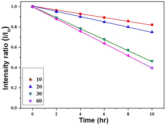 In this equation, A, Io, and I are the absorbance, the transmitted light, and the incident light, respectively. The variables a, b, and c represent the absorptivity (with unit of L mol−1 cm−1), width of the quartz cell containing the detection solution (path length), and the concentration of the detected material in solution (expressed in mol L−1). All the measured absorption intensities at 664 nm are divided by the unmeasured intensity to obtain the normalized values. Figure 10 shows the relationship between the irradiation time of methylene blue degradation and the intensity of the absorbance peak at 664 nm. When ZnO NFAs synthesized at different times were used as photocatalysts, the changes of all the measured results can be represented by a straight-fitting line. Compared to ZnO NFAs synthesized for 10 and 20 min, 30 min and 60 min-synthesized ZnO NFAs have the larger slopes. These results demonstrate that ZnO NFAs synthesized for 30 and 60 min exhibit enhanced photocatalytic responses with respect to methylene blue degradation under UV light irradiation. As Figure 10 shows, the absorbance of the spectral peak at 664 nm decreased monotonically with the irradiation time. When using 60 min-synthesized ZnO NFAs as the photocatalyst, the fitted line obtained by the normalized measured intensities had a larger slope than when the lines were fitted by using ZnO NFAs synthesized for shorter times. This indicates that the 60 min-synthesized ZnO NFAs exhibit the optimum photocatalytic effect in methylene blue degradation. The observed variations in the morphology of ZnO NFAs are consistent with the results shown in Figure 4, indicating that an increase in the total surface area of ZnO NFAs leads to a greater degradation effect on methylene blue.