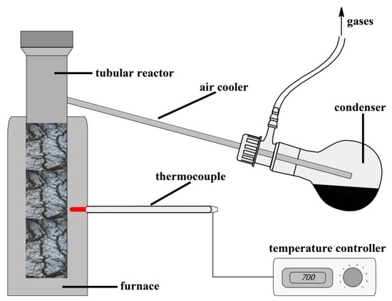 The pyrolysis experiments were obtained without air access at a temperature range of 400–700 °C in the reactor set presented in Figure 2. The reactor was heated to a set temperature at a 10 °C·min−1 heating rate. After it reached the set temperature, the process was continued for 1 to 5 h. After this time, the heating was turned off, and the entire reactor content was allowed to cool down. A round-bottomed flask collected the pyrolytic tar at the tail of the cooling unit. Pyrolysis gases were collected in the calibrated glass bottle. The biochar was weighed after the complete cooling of the reactor. The obtained solid products were ground in a planetary ball mill. They were then characterised according to their physicochemical and adsorption properties. As a result of the pyrolysis processes, eight biochars were obtained under pyrolysis conditions, which are presented in Table 1.