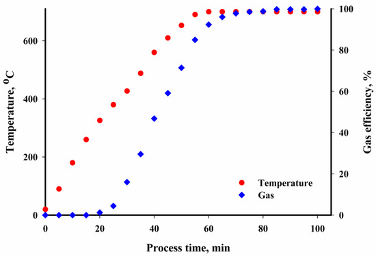 The pyrolysis gas evolved at temperatures ranging from 300 to 700 °C, confirmed by Figure 3 which shows an example of the dynamics of the gas evolved depending on the process temperature. The largest increase in gas volume was observed when the temperature increased above 400 °C. Below this temperature, the dynamics of gas evolution were very slow. Analysis of the gas composition in the Orsat gas analyser showed that the increased process temperature decreased the amount of carbon oxides evolved (Table 4). The amount of energy-valuable methane increased. The remaining volume consisted of hydrocarbons with carbon atoms C2 and C3, the amount of which also rose with the increased process temperature, and NH3, HCN, H2S and CH3S contaminating the gas, as well as water vapour and nitrogen. Similar results were obtained by Gao et al. [43] and Djandja et al. [44], who also observed a decreased amount of CO2 produced in the gases with increasing pyrolysis temperature.