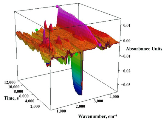 These observations are confirmed by the three-dimensional FTIR spectrum presented in Figure 4 obtained during the thermal decomposition of the tested sewage sludge. The test was carried out in a nitrogen atmosphere, and the rate at which heat was applied to the sample was analogous to the heating rate during the pyrolysis process, that is, 10 °C·min−1. The picture of the spectrum clearly shows that the gases that evolved in the largest amounts were carbon oxides: CO2 (2400–2250 cm−1) and CO (2200–2000 cm−1) [45], methane (1306 and 1354 cm−1) [43], and smaller amounts of volatile organic and inorganic substances such as: alcohols (3584–3700 cm−1 and 1420–1330 cm−1) [46], amines (3500 cm−1) [47], volatile sulphur compounds (1415–1380 cm−1) [48] and alcohols and phenols (980–950 cm−1) [43].