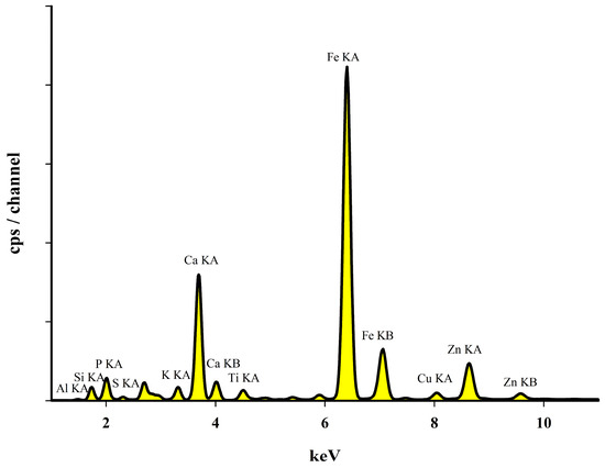 The ash analysis performed using the X-ray fluorescence (EDXRF) technique (Figure 6) showed that the obtained ash contains macro elements such as: Ca, Fe, Si, P, K, Mg or Al. However, it also contains quite large amounts of elements such as: S, Ti, Cr, Mn, Cu, Zn and Na.