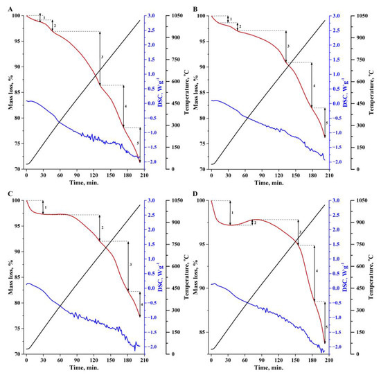 Thermogravimetry differential thermal analysis (TG-DTA) of the biochar samples was carried out in a nitrogen atmosphere at a flow rate of 100 cm3·min−1, with a heating rate of 5 °C·min−1. The appropriate TG-DTA curves are presented in Figure 8. Four or five stages can be distinguished in the thermal decomposition of the samples. The first three endothermic stages are associated with the loss of adsorption moisture and the decomposition of oxygen functional groups: carboxyl, hydroxyl and lactone. In the next two main stages of decomposition, the carbon skeleton of the sample, as well as nitrogen and sulphur-containing groups, are destroyed.