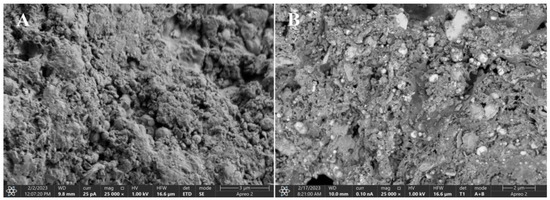 The SEM images of the SSB1 and SSB6 sorption materials presented in Figure 10 confirm these observations. SSB1 has a practically flat surface, while SSB6 consists of particles of irregular shape and grain sizes that tend to agglomerate. The outer surface of the SSB6 also has deep fissures that can form after the removal of volatile organic matter during pyrolysis.