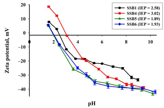 Figure 11 shows the electrokinetic curves estimated for selected samples of the obtained carbon materials. All four samples are characterised by the fairly similar character of the curves and a wide range of zeta potential values, which depend strictly on pH. The presented curves are characteristic of carbon materials [54,55]. SSB1 has a zeta potential of 7.78–(−33.4) mV, SSB4 has 18.6–(−39.1) mV, SSB5 has 4.72–(−43.1) mV and SSB6 material has 5.68–(−42.0) mV, respectively in the analysed pH range. The surface of SSB5 and SSB6 materials is usually negatively charged above pH 2, while that of SSB1 and SSB4 is usually negatively charged only above pH 3. This phenomenon may be conducive to the effective binding of positively charged metal ions. The isoelectric points (pH where the zeta potential is 0) are 2.58, 3.03, 1.89 and 1.93 for SSB1, SSB4, SSB5 and SSB6, respectively.