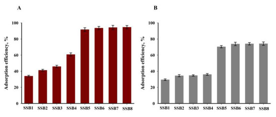 The test results presented in Chapter 3.3 clearly suggest that biochars obtained at temperatures of ≥600 °C are characterised by the best physicochemical properties by far in terms of sorption capacity. To confirm this, preliminary tests were carried out to determine the sorption properties of copper(II) and zinc(II) ions from aqueous solutions. The test results are shown in Figure 12. The tests were carried out for a solution of Cu2+ and Zn2+ ions at a concentration of 100 mg·dm−3. Biochars SSB5–8 are characterised by the best sorption properties in relation to both tested ions. The obtained efficiency of the adsorption process for SSB5 biochar is higher by about 30% than the value obtained for SSB4 for both tested ions. The presented data also indicate that extending the time of the pyrolysis process does not significantly improve the sorption capacity of the obtained biochars. Therefore, further tests were conducted for SSB6.