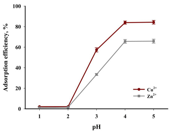The next stage of the study involved determining the influence of pH on the degree of adsorption of Cu2+ and Zn2+ ions. It is an important parameter in the process of ion adsorption on a solid adsorbent, also due to technological solutions. The results of the tests determining the effect of the pH of the solution on the adsorption efficiency of Cu2+ and Zn2+ ions on the tested biochar are shown in Figure 13. The course of the points clearly shows that the adsorption of copper(II) and zinc(II) ions is clearly worse in a strongly acidic environment than in solutions with a higher pH. The calculated difference in adsorption process efficiency between pH = 1 and pH = 5 is 80%, and 65% for Cu2+ and Zn2+, respectively. Metal sorption in a strongly acidic environment is less efficient owing to the protonation of functional groups (that is, carboxylate, -COOH; and hydroxyl, -OH) on the sorbent surface, which undoubtedly reduces metal ion adsorption on the biochar surface due to electrostatic repulsion [56,57]. At low pH, hydronium ions present in higher concentrations also compete with metal ions for adsorption sites available on the biochar surface. An increase in the pH of the solution changes the charge on the surface of the biochar, creating more negatively charged groups and decreasing the competition of Cu2+ and Zn2+ ions and protons for active sites. It should be emphasised that Cu(OH)2 precipitation may occur when the pH of the solution exceeds 6, dominating the adsorption at a sufficiently high pH. In addition, such an environment generates the formation of copper(II) hydroxocomplexes Cu(OH)+, which can make complexation with surface functionalities present in biochar, consequently leading to a decrease in adsorption efficiency [58]. The analysis of the relationships presented in Figure 13 shows that the tested adsorbent has a much higher affinity for copper(II) ions than for zinc(II) ions.