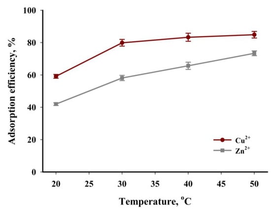The adsorption study was conducted with the use of standard solutions of Cu2+ and Zn2+ with concentrations from 100 to 400 mg·dm−3. Sorption conditions were changed depending on the studied parameters: pH range of 1–5, adsorption temperature 20–50 °C, and contact time of 15–360 min. The detailed description of the adsorption procedure was published elsewhere [28,29].