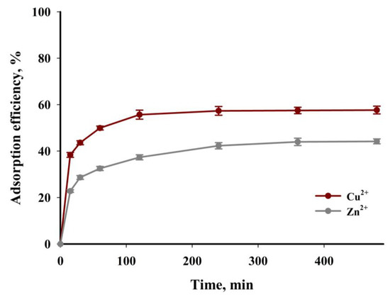 Moreover, the kinetics of the adsorption process was studied. For this purpose, adsorption was conducted with the use of the appropriate amount of adsorbent and Cu2+ or Zn2+ solutions at 300 mg∙dm−3, in 15–360-min intervals, at a temperature of 40 °C. The equilibrium capacity of the adsorbent qe (mg∙g−1) was calculated according to Equation (2):