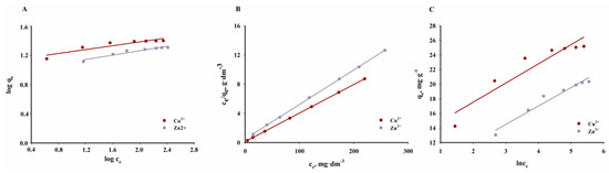 where qe (mg·g−1)—real adsorption at sorption equilibrium, ce (mg·dm−3)—equilibrium concentration of cations, KF (mg·g−1)—the Freundlich constant, 1/n—characteristic constant related to the energy heterogeneity of the adsorbent surface, qm (mg·g−1)—the maximum monolayer capacity, K (dm3·mg−1)—the Langmuir constant, AT (dm3·g−1)—the equilibrium binding constant, and B = (J·mol−1)—the constant related to the heat of sorption, bT—the adsorption constant.