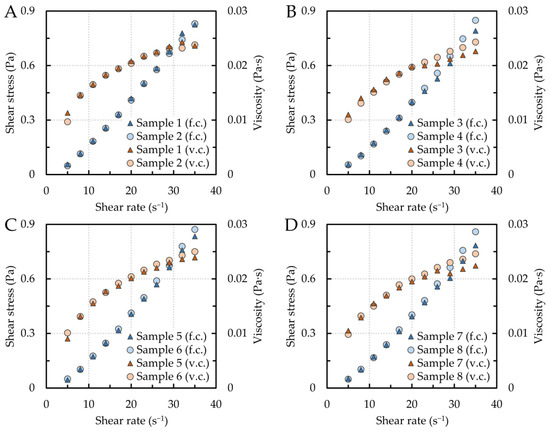 Flow (f.c.) and viscosity (v.c.) curves for samples (A) 1 and 2, (B) 3 and 4, (C) 5 and 6, and (D) 7 and 8.
