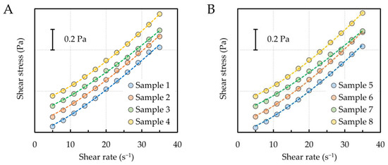 Flow curves fitted by the Herschel–Bulkley model (dashed lines denote the fitting curves); (A)–samples 1–4, (B)–samples 5–8.