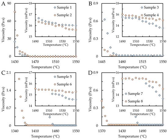 The temperature dependence of the dynamic viscosity of the samples was experimentally investigated during the cooling process, i.e., in the temperature interval from the maximum temperature (1550 °C) to the solidification temperature. The obtained dependencies are shown in Figure 3A–D. As shown in the figure, the dynamic viscosity increases exponentially with decreasing temperature, which agrees with the Arrhenius equation [35]. The details show the dependence of the dynamic viscosity on temperature when the sample is in the liquid state. It can be argued that the effect of chemical composition—Ni, Cr, and C contents—is almost negligible in the investigated concentration ranges of Cr (0.924–4.796 wt%), Ni (1.084–4.478 wt%), and C (0.043–1.378 wt%). However, a slight increase in viscosity with increasing chromium content can be observed in Figure 3B, where sample 3 with 0.924 wt% chromium had a viscosity of 13.6 mPa at 1550 °C, while sample 4 with 4.796 wt% chromium had a viscosity of 15.0 mPa at the same temperature. It is worth noting that a similar effect of chromium was observed for ternary alloys containing chromium and nickel, but the chromium content varied in the order of tens of percent [14,26]. A similar trend can be observed for increasing carbon content (Figure 3C,D). For samples 5 (0.043 wt% C) and 6 (1.563 wt% C), containing roughly the same nickel content of about 4.5 wt%, the dynamic viscosity values at the maximum temperature were 14.7 and 14.6 mPa, respectively. Additionally, for samples 7 (0.043 wt% C) and 8 (1.378 wt% C) with approximately the same chromium content, the viscosity increased slightly from a value of 13.4 mPa to a value of 14.5 mPa. A slight decrease in viscosity can be observed with increasing nickel content (Figure 3A), yielding viscosities of 16.0 mPa for sample 1 (1.084 wt% Ni) and 15.2 mPa for sample 2 (4.478 wt% Ni). In the same vein, Dubberstein described a moderate decrease in viscosity depending on the nickel content for Fe–Cr–Mn–Ni alloys with 3–6 wt% Ni [27].