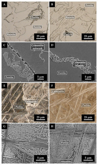 Firstly, metallographic samples were polished and etched (nital etching process). Consequently, the structures were examined using an Olympus IX70 (LM) light microscope (Olympus, Melville, NY, USA) and a JEOL 6490 LV scanning electron microscope ((JEOL Ltd., Akishima, Japan)) operating in a secondary electron mode, equipped with an INCA EDX (Energy Dispersive X–ray Spectroscopy) analyzer (Oxford Instruments, Oxford, UK) enabling X-ray analysis. The SEM settings were as follows: thermionic cathode LaB6, voltage 20 kV, and the specimen chamber kept at 10−3 and 25 Pa.
