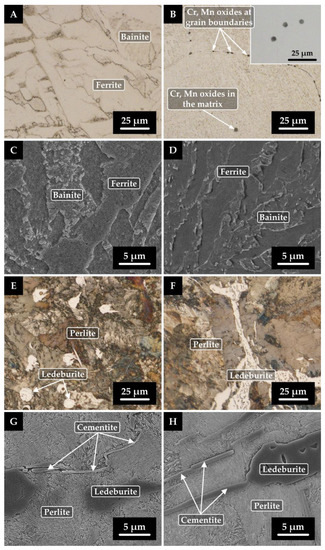 Samples with significantly varying carbon contents and the maximum amount of alloying element (Cr and Ni) were tested using SEM and EDX analyses in both the initial state and after rheological experiments (after high-temperature testing). Specifically, samples 5 (0.043 wt% C; 4.465 wt% Ni), 6 (1.563 wt% C; 4.495 wt% Ni), 7 (0.043 wt% C; 4.863 wt% Cr), and 8 (1.378 wt% C; 4.591 wt% Cr) were investigated for changes in internal structure. The results of these analyses are shown in Figure 4 and Figure 5. Figure 4A–D and Figure 6A–D show the microstructures of the samples with low carbon content, i.e., samples 5 and 7 (0.043 wt% C). When comparing the microstructures of these samples in the initial and remelted states, it can be surmised that no significant changes in their internal structure occurred during the rheological measurements. In both samples, bainitic ferrite or bainite is present in the initial and remelted states. Sample 5 (4.465 wt% Ni) contains minor amounts of perlite and a coarse cementite network. For sample 7 (4.863 wt% Cr), bainitic ferrite and bainite are more etchable. In the center of this sample in the remelted state, complex oxide inclusions (Cr or Mn oxides) were detected in the bulk grain and along the grain boundaries (Figure 5B). This was supported by EDX analysis, the results of which are shown in Table 4 and Figure 6, containing the most representative spectra of EDX spot microanalysis. The presence of these oxides is due to the order of magnitude higher oxygen content of this sample compared to the other specimens. Figure 4E–H and Figure 5E–H show the microstructure of samples 6 and 8 with a higher carbon content (1.563 and 1.378 wt% C). In both cases, a dominant structure of lamellar perlite is observed. For sample 6 (4.495 wt% Ni), cementite plates are present in the initial state, including a fine cementite network excluded along grain boundaries. However, after rheological testing, only plates of cementite are present. The lamellae of pearlite appear finer after the rheological experiment. In sample 8 (4.591 wt% Cr), globular islands of ledeburite are present in the initial state and are altered in the remelted state to larger blocks of reticulated ledeburite along grain boundaries.