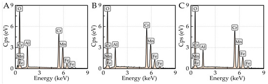 EDX spectra collected from spot microanalysis of sample 7; (A–C) correspond to spectra 1, 2, and 3.