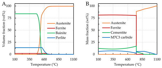 Phase formation as a function of temperature—(A) sample 7, 0.043 wt% C, 4.863 wt% Cr; (B) sample 8, 1.378 wt% C, 4.591 wt% Cr.