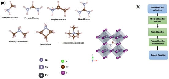 (a) Schematic representation of ABX3 with different molecules, metals, and halide atoms. Carbon, nitrogen, and hydrogen atoms are illustrated in dark brown, gray, and light pink, respectively. (b) Flow chart of a typical procedure for training classification models, or classifiers, in the Classification Learner program.