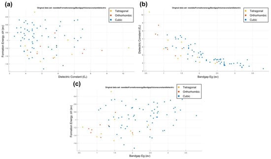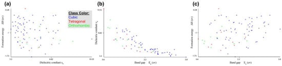 Formation energy and structural stability: the relationship between attributes obtained using MATLAB. (a) Formation energy vs dielectric constant, (b) Dielectric constant vs band gap and (c) formation energy vs band gap.