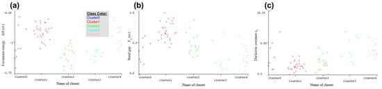 Clustering following the physical property obtained in WEKA. (a) Formation Energy; (b) Band gap; (c) Dielectric constant.