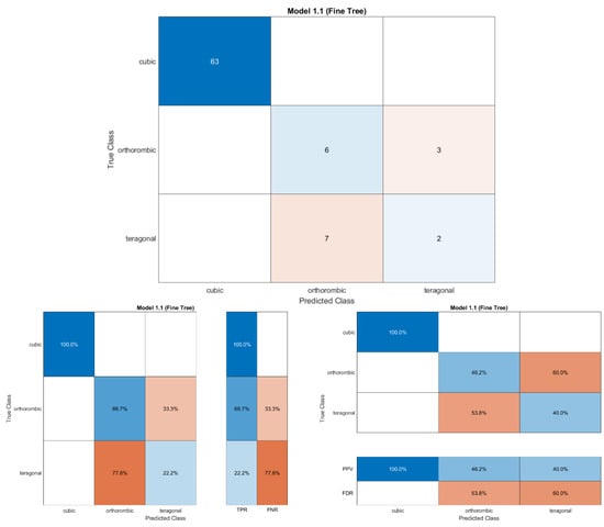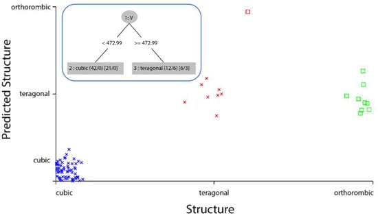 To make a classification of data, we used both WEKA and MATLAB programs and then compared the results between each. At first, we used the WEKA program to test some classification algorithms on the data. We obtained the best accuracy with the (trees.REPTree) classifier, with an accuracy of 87.65%. For the Kappa statistic, which is the percentage decrease in errors resulting from random classification [20], we got a ratio of 0.6667. The Root Mean Squared Error (RMSE) has a good value of 0.1973, which is a measure of how accurately the model predicts the response. [4]. The classification results are shown in the supplementary information (Section 3). As shown in the classification results in Supplementary Material S3, in the confusion matrix of the classifier, all 63 cubic structures have been correctly classified. In contrast, the tetragonal was incorrectly classified once as an orthorhombic. All nine orthorhombic were incorrectly classified as tetragonal. The tree and visualization classifier errors of (trees.REPTree) classifiers are shown below in Figure 5, in which the cubic points are the error-classified structures.