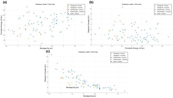 The classification error representation of the tree classifier, where x points represent the incorrect classification of data. (a) Formation Energy; (b) Band gap; (c) Dielectric constant.
