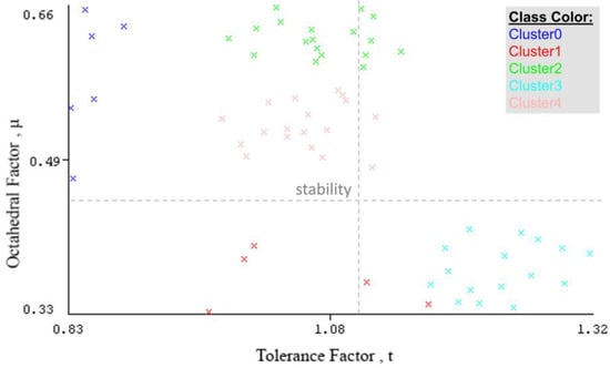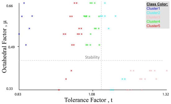 As shown in Figure 7, values in Cluster3 are within an instability limit for the tolerance and octahedral factors (where the stability limits are 0.81 < t < 1.11 for the tolerance factor, and 0.44 < μ < 0.89 for the octahedral factor). Compounds in Cluster0, Cluster2, and Cluster4 have approximately stable values for both tolerance and octahedral factors. Figure 8 shows the values of tolerance and octahedral factors based on cluster number after using the filter (add cluster) in WEKA to add the number of clusters as an extra category in the stability database.