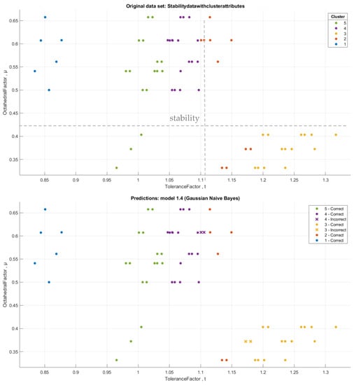 Figure 11 shows the confusion matrix of the Gaussian Naïve Bayes algorithm, which represents the True Positive Rate (TPR) and False Negative Rate (FNR) of the predicted class. All clusters were correctly predicted except Cluster2. Four compounds in Cluster2 were incorrectly predicted; two of them were predicted as compounds in Cluster3 and two as compounds in Cluster4. We coded a short program model in MATLAB using the conditions of the stability limits to identify the stable compounds; “non” if all factors are in the instability limits, “one stable” if only one factor is in the stability limits, and “stable” if both t and μ factors are in the stability limits. The script of the model is reported in the supplementary information (Supplementary Material S10).