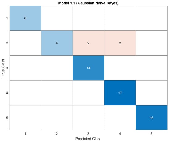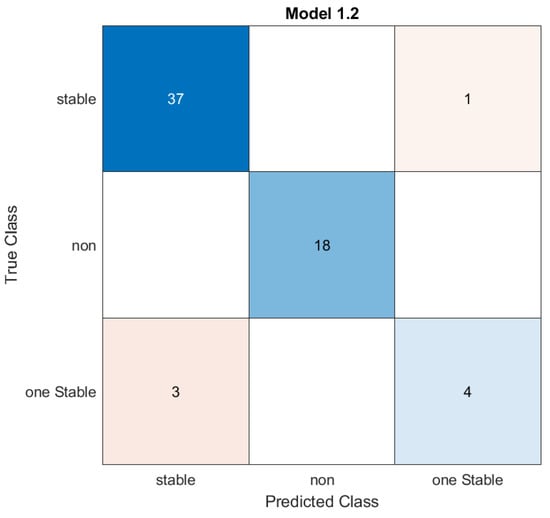 We performed a classification of the data with stability conditions using the Classification Learner App in MATLAB. When we used all classifiers, the best accuracy was for the Kernel Naive Bayes classifier [26,27,28] with an accuracy rate of 93.7%. Figure 13 and Figure 14 below show the visualization of the prediction errors and confusion matrix of the classifier.