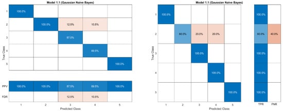 The confusion matrix, TPR and FNR matrix, and PPV and FDR matrix.