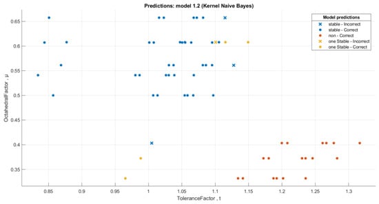 Table S4 (supplementary information, Supplementary Material S11) shows the final 38 compounds extracted from the main dataset that are within the stability limits of the t and μ factors. Finally, we made a classification of the final 38 stability data using the Classification Learner App in MATLAB. When we used all classifiers, the best accuracy was for the Kernel Naive Bayes classifier, with an accuracy rate of 94.7%. The Figures S3 and S4 in the supplementary information (Supplementary Material S11) below show the visualization of the prediction errors and confusion matrix of the classifier.