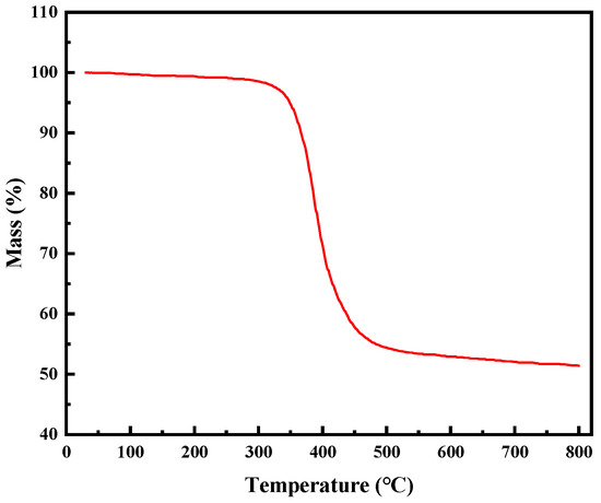 GFRP is mainly composed of epoxy resin and glass fibers. Glass fibers have good high-temperature resistance, while the high-temperature resistance of epoxy resin varies depending on the composition of the material. Due to the uncertainty of the composition of epoxy resin in the waste GFRP powder, and the unclear effects of environmental factors on the thermal stability of GFRP during the use of wind turbine blades, TGA analysis was performed on the GFRP to prevent the melting or combustion of the waste GFRP powder during the experimental process and ensure the thermal stability of GFRP material in the HMA mixing process. Figure 1 shows the results of the thermogravimetric analysis conducted on the GFRP powder. It was observed that the mass loss of the GFRP powder occurs primarily between 300 °C and 450 °C, indicating that the decomposition temperature of the epoxy resin is above 300 °C. At 450 °C, the resin has almost completely decomposed, accounting for about 55% of the total mass. The remaining 45% consists of high-temperature-resistant glass fiber and pyrolytic carbon. These results demonstrate that the GFRP powder has excellent thermal stability, making it suitable for asphalt pavement construction.