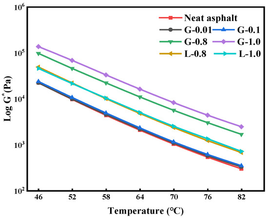 Figure 2 depicts the temperature-log G* graphs for various asphalt mastics. As per the figure, a linear relationship exists between temperature and logarithm of G*. The high temperature performance of asphalt mastic is significantly impacted by the type and quantity of filler. The higher the filler content, the more significant the improvement in the resistance to high-temperature rutting of the asphalt mastic [36,37]. The high-temperature performance of G-1.0 and G-0.8 has been significantly improved, followed by L-1.0 and L-0.8. Conversely, there is no significant change in the high-temperature performance of G-0.01 and G-0.1. Based on the material properties, GFRP has a larger surface area and can absorb more free asphalt compared to limestone powder, making it more effective in enhancing the high-temperature performance of the asphalt mastic compared to limestone powder of the same content.