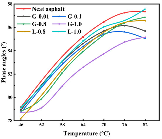 Figure 3. The phase angles of asphalts and mastics.