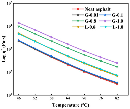 As seen in Figure 4, there is a clear linear relationship between log η* and temperature. The value of η* decreases gradually with the increase in temperature due to the enhanced movement between asphalt molecules, which makes it easier for the asphalt to be displaced under external forces. During the temperature range of 46 °C to 82 °C, the complex viscosity of GFRP asphalt mastic is higher than that of limestone asphalt mastic. This is due to the stronger interaction between GFRP and asphalt, which improves the complex viscosity of the asphalt mastic and enhances its resistance to rutting at high temperatures. The η* value increases with the increase of GFRP content because the larger surface area of GFRP provides more contact with the asphalt binder, leading to a stronger interaction between the two materials and an increase in the structural asphalt content in the GFRP asphalt mastic. However, it may be necessary to choose a higher construction temperature to ensure the fluidity of the asphalt mixture, as GFRP asphalt mastic requires a temperature increase of 6 °C to 12 °C to achieve the same η* as conventional limestone asphalt mastic.