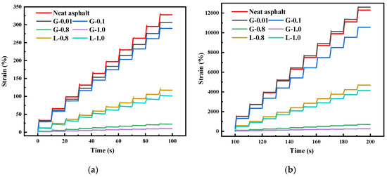 Figure 5. Strain-time diagram of asphalts and mastics: (a) 0.1 kPa; (b) 3.2 kPa.