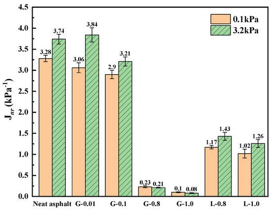 The MSCR tests in this study were carried out per the ASTM D7405-15 standard [35]. A 25 mm diameter test plate mold with a parallel plate spacing of 1 mm was used. The MSCR tests were performed at 60 °C with two stress levels, 0.1 kPa and 3.2 kPa. Each sample was tested three times. The samples underwent 20 cycles of loading and recovery at a stress level of 0.1 kPa, followed immediately by 10 cycles of loading and recovery at a stress level of 3.2 kPa, with no interval between the two phases. During the loading cycle, the sample was loaded at a constant stress for 1 s. Then the load was removed for 9 s to allow the sample to recover. The irreversible creep compliance Jnr (Equation (1)) and recovery rate R (Equation (2)) reflecting the rutting resistance potential of asphalt can be obtained through the MSCR test. The average values of Jnr and R for asphalt samples under 10 stress cycles of 0.1 kPa (Jnr0.1 and R0.1) and the average values of Jnr and R for asphalt samples under 10 stress cycles of 3.2 kPa, (Jnr3.2 and R3.2) were calculated respectively according to Equations (3)–(6).