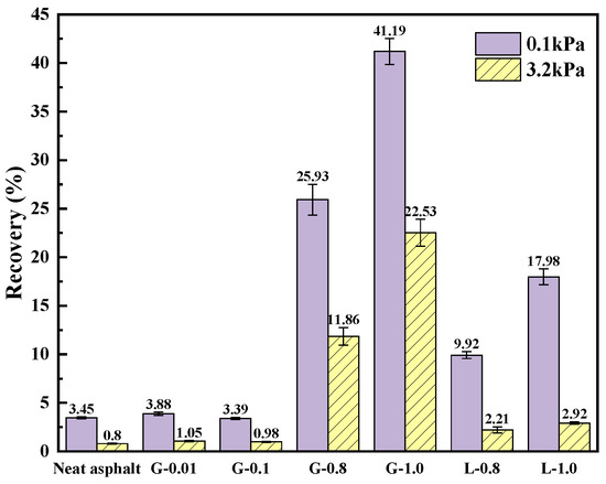 The non-recoverable creep compliance (Jnr), which represents the rutting sensitivity, and the recovery rate (R), which represents the elastic response, of asphalt mastic were obtained through the MSCR method [35]. As shown in Figure 6, the Jnr of the asphalt mastic decreases continuously with the increasing content of GFRP powder. At a content of 0.8, there is a sharp decrease in Jnr. Compared to limestone filler, GFRP powder has a better ability to inhibit the deformation of the asphalt mastic, resulting in a permanent deformation that is 80.3% to 93.6% lower than that of limestone asphalt mastic. This is likely due to the strong mechanical properties of GFRP powder and its effective combination with asphalt through physical and chemical interactions. The Jnr at 3.2 kPa shows a similar trend to that at 0.1 kPa, with a rapid decrease when the filler-asphalt mass ratio t reaches 0.8:1. The difference between Jnr0.1 and Jnr3.2 also narrows. However, there is a slight deterioration of Jnr when the filler-asphalt mass ratio is 0.01:1.