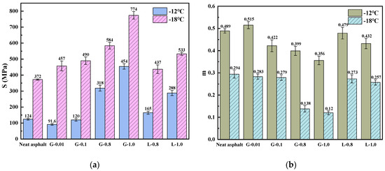 Figure 8. BBR test results in terms of S and m of asphalts and mastics: (a) Stiffness (S); (b) Creep rate (m).