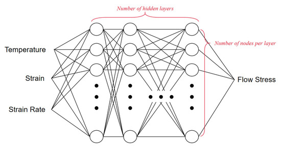 An ANN model was employed in this work for flow stress prediction. We illustrate the structure of the employed ANN model in Figure 2. It consisted of an input layer, hidden layers, and an output layer. In this model, the input layer consisted of three nodes, corresponding to three variables: temperature, strain rate, and strain. In terms of the output layer, it only consisted of one node, which is the value of flow stress. In the hidden layers, we applied to each hidden layer the same number of neurons, represented as . The total number of hidden layers is represented as . The structure of ANN is noted by . In this work, we aimed to clarify the influence of ANN structure on accuracy. The ANNs with structures of , , , and are taken as four typical cases in the analysis in this work.
