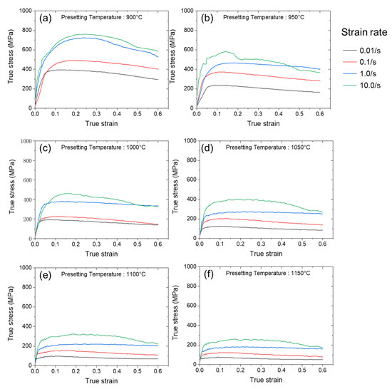 Experimentally measured stress-strain curves of In718 alloys at different temperatures and strain rates. The curves are grouped according to the testing temperature. The measured stress-strain are plotted in different colors for 0.01, 0.1, 1.0, and 10.0 in each figure. (a–f) are the experimental measured stress-strain curves at 900 °C, 950 °C, 1000 °C, 1050 °C, 1100 °C and 1150 °C.
