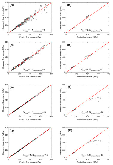 Plot of the measured flow stress versus the predicted flow stress of In718 alloy using ANNs with different structures. (a,c,e,g) are the training dataset, and (b,d,f,h) are the validating dataset. The ANN structure is noted inside each plot.