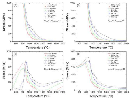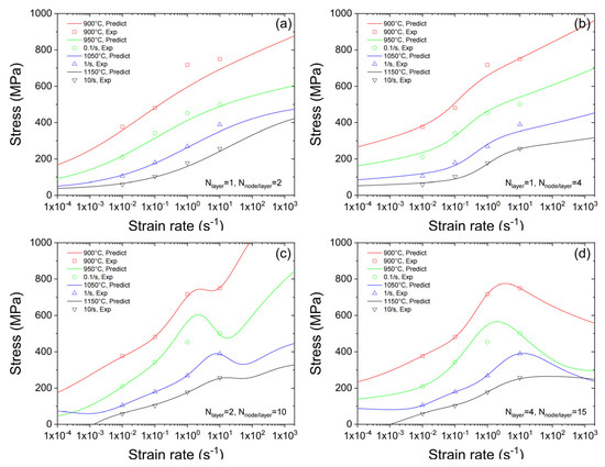 Figure 7a–d plots the predicted flow stress versus the strain rate using ANNs with different sizes. It could be found that the predicted flow stress increases monotonically with the increase in the temperature when the ANN has either one hidden layer/two nodes per hidden layer or one hidden layer/four nodes per hidden layer. This outcome is consistent with the general law that the material is hardened with the increase in temperature, which is also supported by the experimental data. However, as shown in Figure 7a,d, the predicted curve of flow stress exhibits more fluctuation, which makes the predicted curve not monotonic. It is also interesting to note that, when using small ANNs, there is no significant underfitting in strain rate dependence.