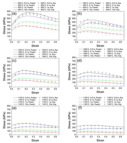 Predicted flow stress using the optimized ANN. (a–f) are the predicted stress-strain curves at 900 °C, 950 °C, 1000 °C, 1050 °C, 1100 °C and 1150 °C.