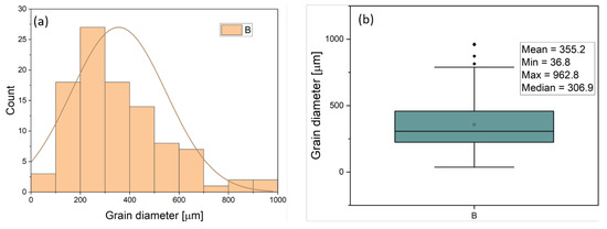 Grain size distribution plots: (left) grain diameter distribution curves (right) box and whisker charts with statistical derivations (a,b) Sample B, (c,d) Sample T1, (e,f) Sample T2, (g,h) Sample T3, (i,j) Sample T4.