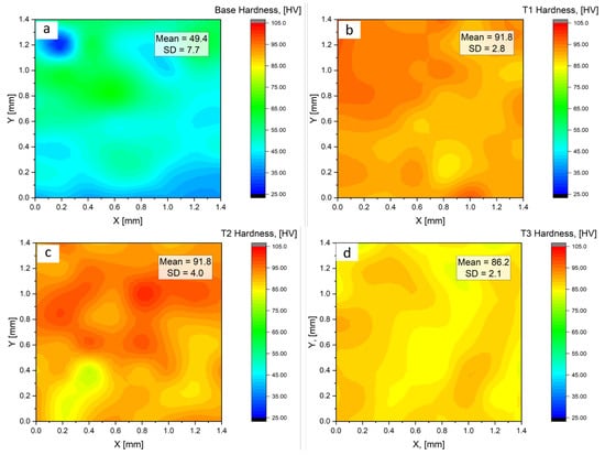 Vickers microhardness maps for studied samples, considering all surface conditions over an area of 1.4 mm × 1.4 mm (a) Sample B (b) Sample T1 (c) Sample T2 (d) Sample T3 (e) Sample T4.