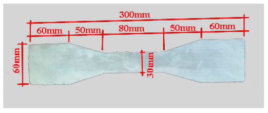 In this test, the main components of ECC include Type I ordinary Portland cement. The measured compressive strength after 28 days of curing was 42.5 MPa; high quality fly ash, fineness was 43 μm, density was 2.4 g/cm3, and water content was 0.5%; for white crystalline quartz sand, fineness was 100~200 mesh; for PVA fibers, length was 9 mm, diameter was 31 μm, tensile strength was 1500 MPa, elastic modulus was 42 GPa, and elongation was 6%; polycarboxylate is a high performance water-reducing agent. The experimental mix proportion of ECC is shown in Table 1. According to Chinese Standard JC/T 2461-2018: Standard test method for the mechanical properties of ductile fiber-reinforced cementitious composites [38], the dumbbell-shaped specimens were made to test the tensile properties of ECC material, and the specified size of tensile specimen is shown in Figure 2. The thickness of ECC specimen is 13 mm.