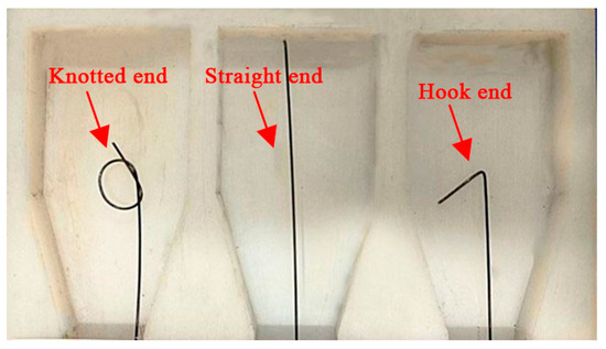 In order to study the bonding properties of SMA fiber and ECC matrix, direct pullout tests of SMA-ECC specimens were carried out, and the SMA fiber diameter, end shape, and bond length were taken as the main influencing factors. The diameters of the SMA fiber are 1 mm, 1.2 mm, and 1.5 mm, respectively. The end shapes are set to be straight, hook, and knotted, as shown in Figure 6. The bonding length was set to be 30 mm, 40 mm, and 50 mm, not including the length of hook or knot. The grouping table of the test specimens is shown in Table 3. The specific dimensions of the specimens are shown in Figure 7. The ECC mix ratio used in the tests is the same as Table 1. After being fabricated, the specimens were placed into a standard curing box, demolded after 24 h, and put into the water tank to continue standard curing for 28 days.