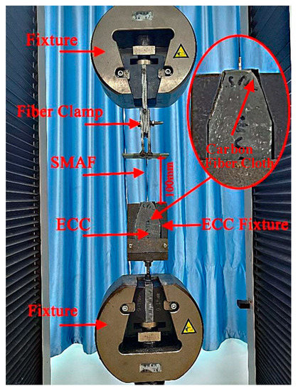 A universal testing machine was used for the direct pullout test, and the loading speed was controlled by the pulling displacement as 2 mm/min. The loading was stopped when the fiber was broken or pulled out. In order to reduce the slip between the ECC matrix and the fixture of the testing machine, a specific ECC fixture was used to fix the matrix, and the carbon fiber cloth was used to wrap the specimen to reduce the stress concentration of the fixture. A specific fiber clamp was used to fix the free end of the SMA fiber. The length of the free tensile section was 100 mm. The built-in sensor of the testing machine was used to record the load and the pulling displacement during the test. The test data were synchronously collected by the computer. The test devices are shown in Figure 8. The pull-out test analyzed the bonding behavior of SMA fiber and ECC matrix, the bond failure process, and the stress level of SMA fibers. Therefore, this study analyzed the principal indicators such as load, displacement, and SMA fiber stress, and expressed them by the load–displacement–stress combination curve. On this basis, the bond-bearing capacity and SMA fiber strength utilization ratio was compared.