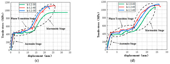 The specimens in this group include k-1.2-30, k-1.2-40, and k-1.2-50, and SMA fibers in these specimens have the same diameter and end shape but a different bond length. As shown in Figure 9c, SMA fibers in these specimens can all experience the phase transformation and martensitic hardening stage before being fractured. From Table 4 and Figure 10, the maximum pullout stresses are 943 MPa (k-1.2-30), 1116 MPa (k-1.2-40), and 1101 MPa (k-1.2-50), which shows that longer bond length results in higher pullout stress. However, as to the maximum displacement, bonding length has an opposite effect. It is because longer bond length can provide greater frictional resistance between SMA fiber and ECC matrix. Therefore, the pullout stress can be increased, and the slip can be decreased. The maximum pullout stresses of the SMA fibers in k-1.2-40 and k-1.2-50 are very close, which is because there is an effective bond length between SMA fiber and ECC matrix when the bond length is close to or exceeds the effective bond length, and the interfacial friction cannot continue to increase with the increase of bond length [42].