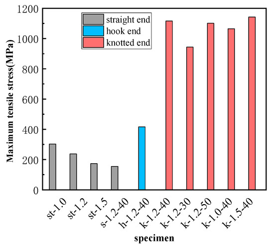 The specimens in this group include k-1.0-40, k-1.2-40, and k-1.5-40, and SMA fibers in these specimens have the same bond length and end shape but different diameters. Figure 9d shows that all the SMA fibers can enter the martensitic hardening stage before fractured. From Table 4 and Figure 10, the maximum pullout stress is 1064 MPa (k-1.0-40), 1116 MPa (k-1.2-40), and 1142 MPa (k-1.5-40), showing that larger fiber diameter leads to higher maximum pullout stress, which is different with the fibers in the first group. This is because knotted ends can provide significant anchorage force, especially at the ultimate state, and the bond-bearing capacity of the knotted end fiber mainly comes from the anchorage force. As the fiber diameter increases, the anchoring force increases, resulting in higher pullout stress.